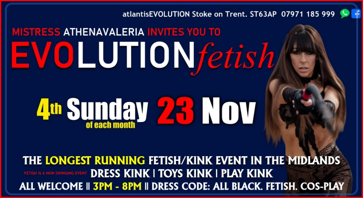 Sunday 23 NovemberEvolutionfetishSunday Fetish Events: 3pm-8pmLifetime Membership is £20 ppEntrance is £10 pp.All welcome.DRESS CODE:ALL BLACK. FETISH. COS-PLAYPlease CLICK HEREor the Fetish Link aboveNOTE:FETISH IS A NON SWINGING EVENTMistress AthenaValeria invites you to:EVOLUTIONfetishMy first fetish event was Thursday 28 July 2011 EVOLUTIONfetish and was a great success. Every event since has gone from strength to strength. EVOLUTIONfetish is a friendly, no pressure environment. All people are welcome and celebrated.(Known by regulars as ‘EVO’ . . . most definitely isn’t ‘50 Shades’ and you won’t find a furry-pink-cuff anywhere. It’s for real fetishists and BDSM or those looking to become involved in the Fetish lifestyle. We invite anyone new to visit us and see if it’s for you. Furthermore, We promise a thoroughly supportive network of Mistresses and Masters at all our events. They are there to help and guide.All Genders, Sexualities, ages (18+), and levels of experience are welcome.Interested in Fetish but don’t know where to start? Try here . . . https://en.wikipedia.org/wiki/BDSMPlease Note: Fetish is a NON Swinging event.