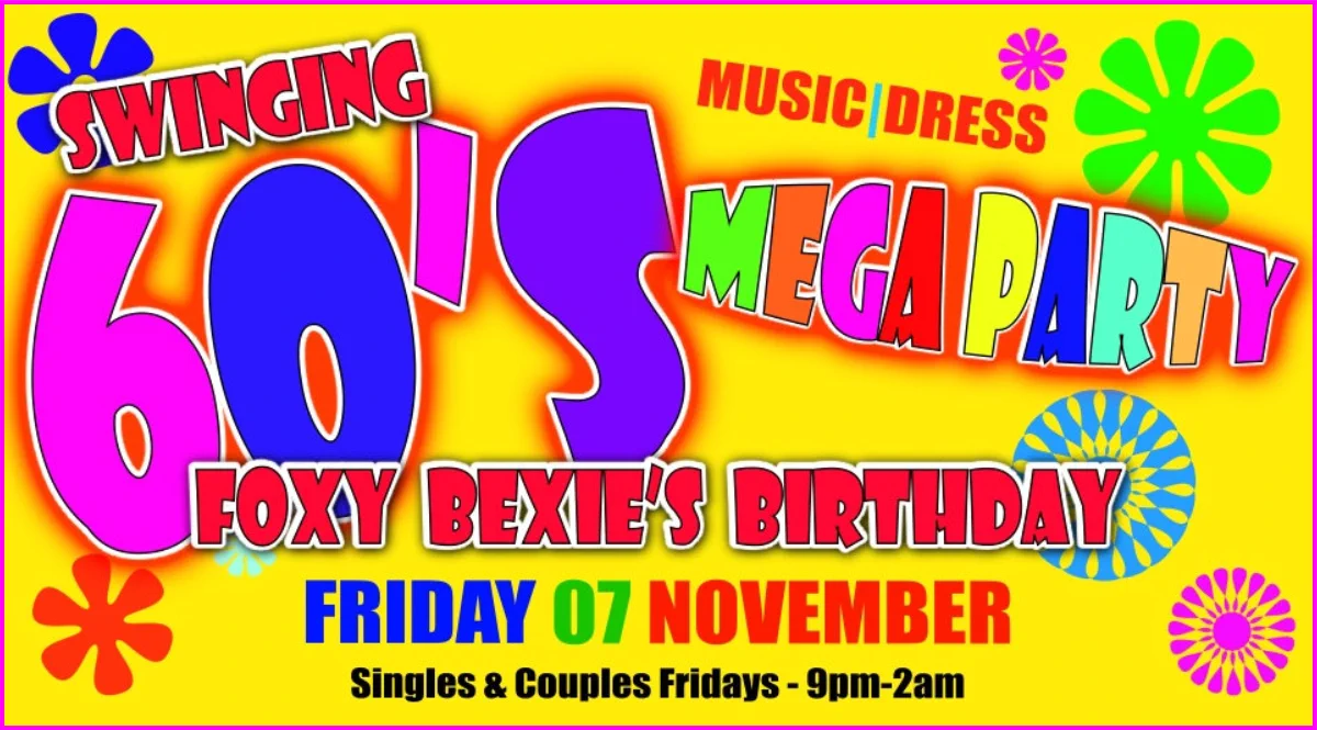 Friday 07 November‘Foxy Bexie’s Swinging 60’s Birthday Party’‘A proper fun-filled night out!’Singles and Couples Friday9pm-2amBring Proper ID to Join