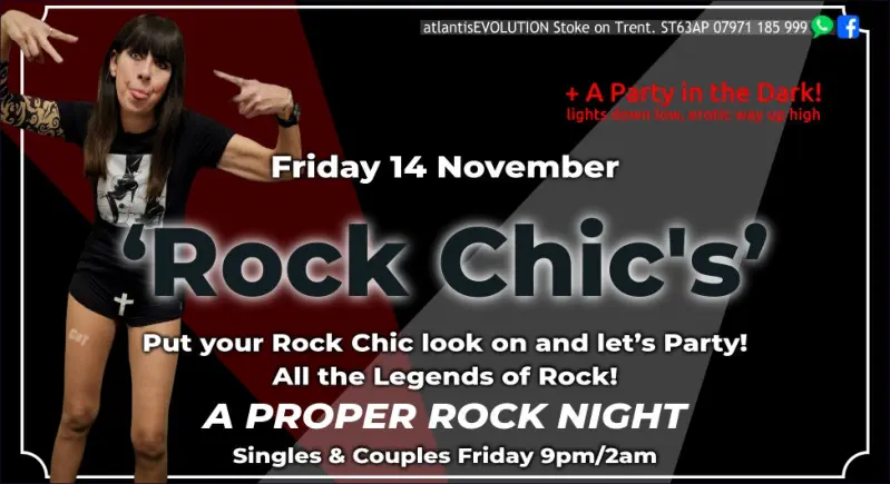 Friday 14 November‘ROCK CHIC’S’Put your Rock Chic Look on and let’s party!All the Legends of RockA PROPER ROCK NIGHT+ Incorporating‘A PARTY in the DARK’Singles and Couples Friday9pm-2amBring Proper ID to Join
