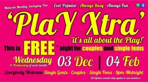 Wednesday 03 DecWednesday 04 Feb‘PlaY Xtra’‘it’s all about the Play!’1st Wednesday of each month8pm till MidnightFREE4Couples& Single FemsEVERYONE WELCOMESINGLES / COUPLES / FEMS