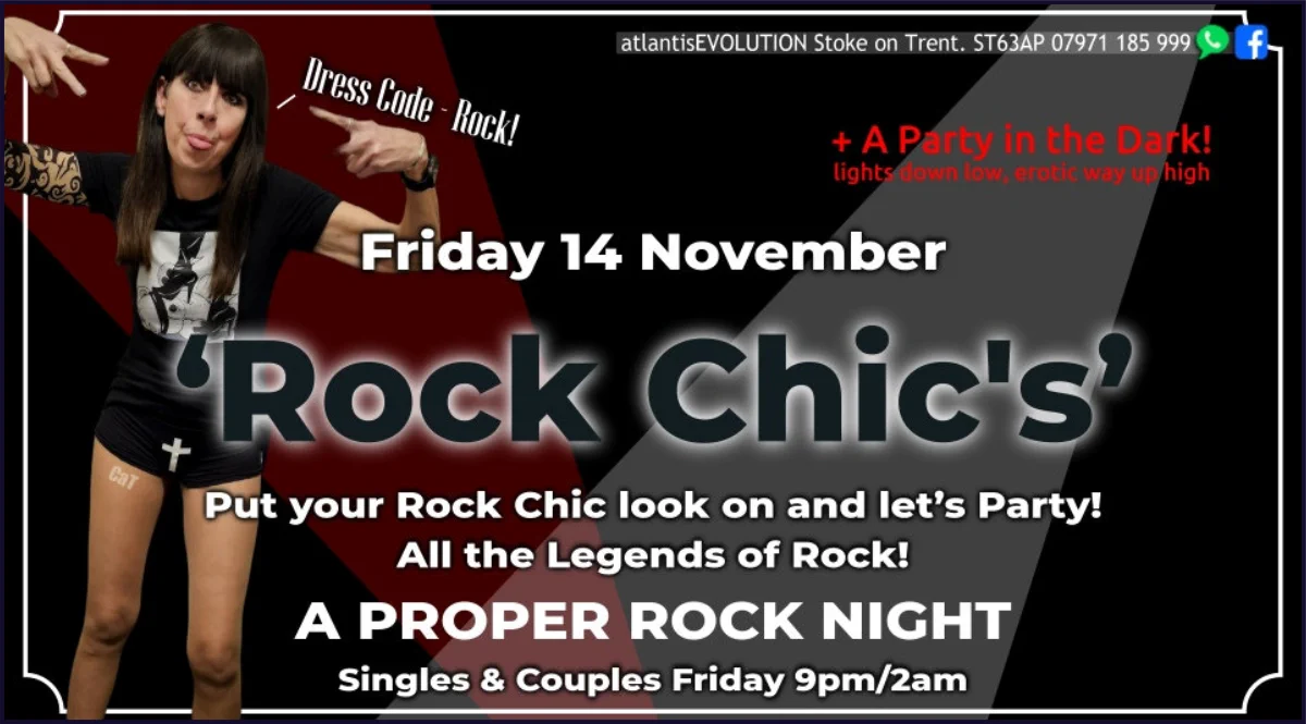 Friday14November‘ROCK CHIC’S’Put your ‘Rock Chic’ look on and let’s party! All the Legends of Rock. Dress Code ROCK | A PROPER ROCK NIGHT OUT+ Incorporating ‘A PARTY in the DARK’