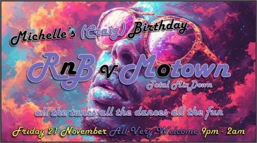 Friday 21 NovemberMichelle’s Birthday‘RnB v Motown’Total Mix-DownAll the Tunes all the Dances‘Meet. Chill. Chat. and Play!’Singles & Couples Saturday9pm-2amBring Proper ID to Join