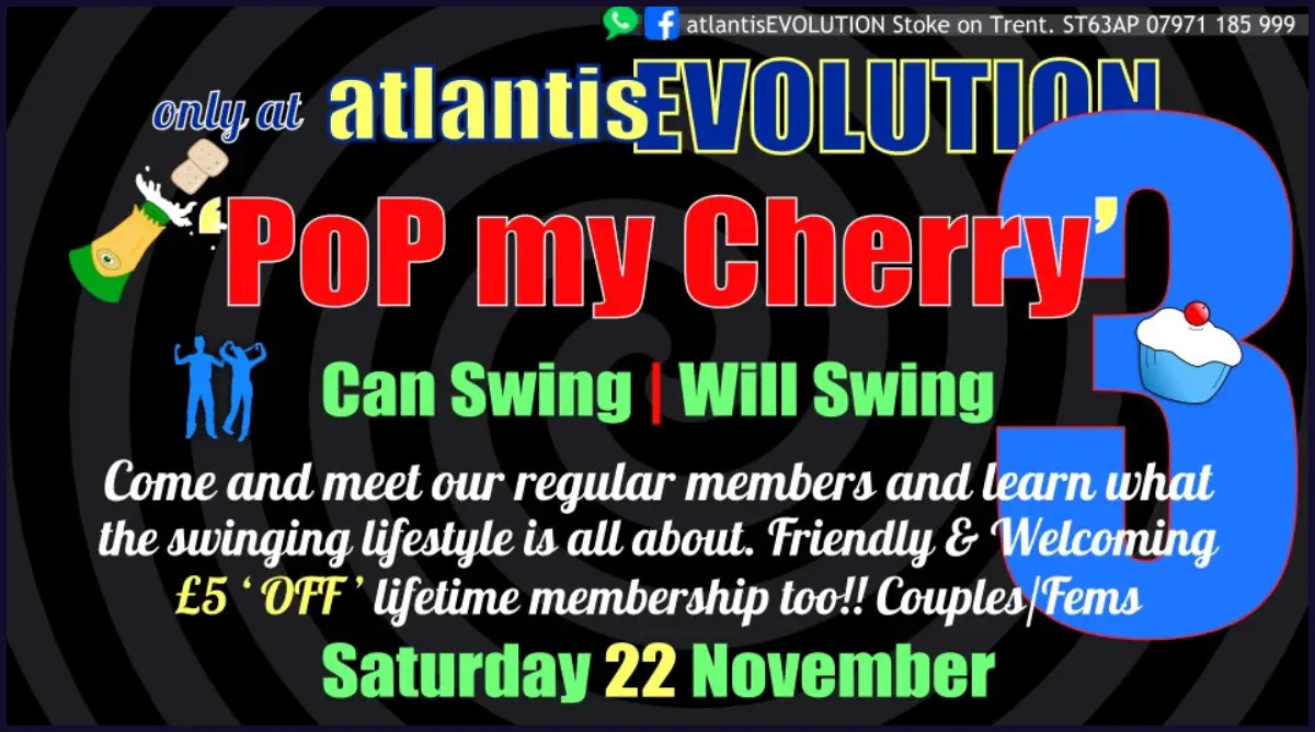 Saturday 22 November‘PoP my Cherry’Come and meet our regular membersand learn what the swinging lifestyleis all about.Friendly & Welcoming£5 Off Lifetime Membership too!!MEET | PARTY | PLAY | CHILLCouples and Single Fems SaturdaySINGLE GENTS ARE NOT ALLOWEDON A SATURDAY9pm-2am