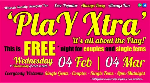 Wednesday 04 FebWednesday 04 Mar‘PlaY Xtra’‘it’s all about the Play!’1st Wednesday of each month8pm till MidnightFREE4Couples& Single FemsEVERYONE WELCOMESINGLES / COUPLES / FEMS