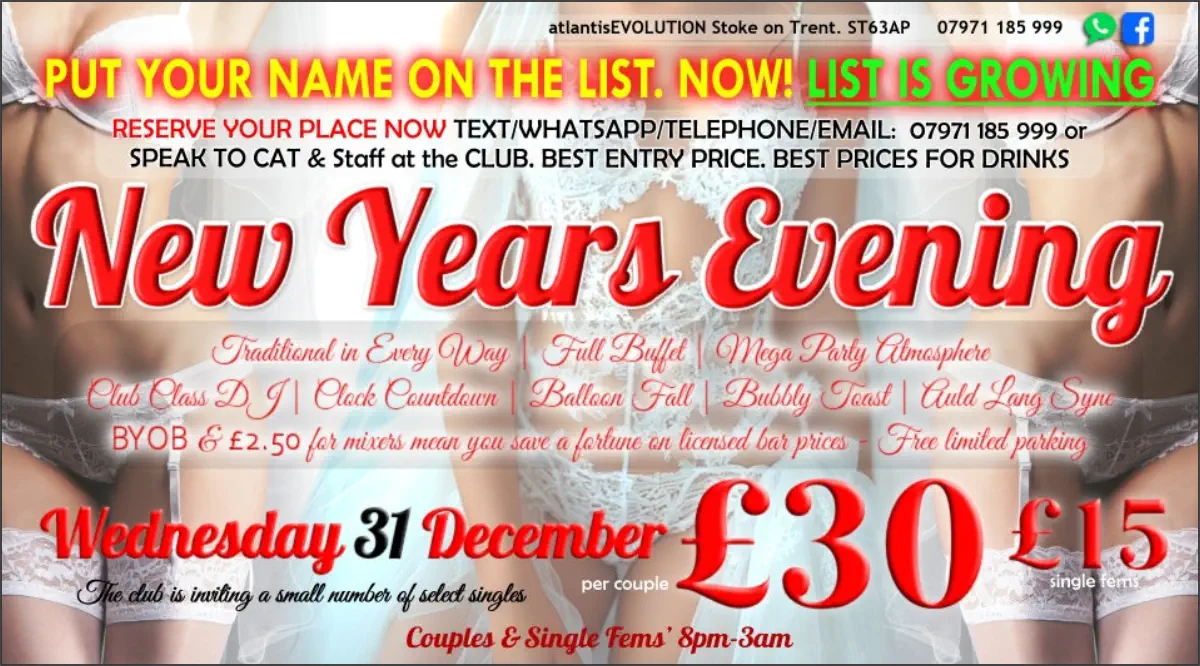 Wednesday 31 DecemberNew Years EveningPut your Name on the List NOW!Traditional in every wayFull Buffet | MEGA Party Atmosphere| Clock CountdownBalloon Fall | Auld Lang SyneGet Listed Now!!!‘it’s where the party people party’MEET | PARTY | PLAY | CHILLCouples and Single Fems Saturday9pm-2am