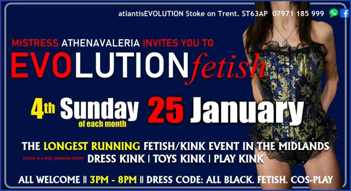Sunday 25 January 2026EvolutionfetishSunday Fetish Events: 3pm-8pmLifetime Membership is £20 ppEntrance is £10 pp.All welcome.DRESS CODE:ALL BLACK. FETISH. COS-PLAYPlease CLICK HEREor the Fetish Link aboveNOTE:FETISH IS A NON SWINGING EVENT