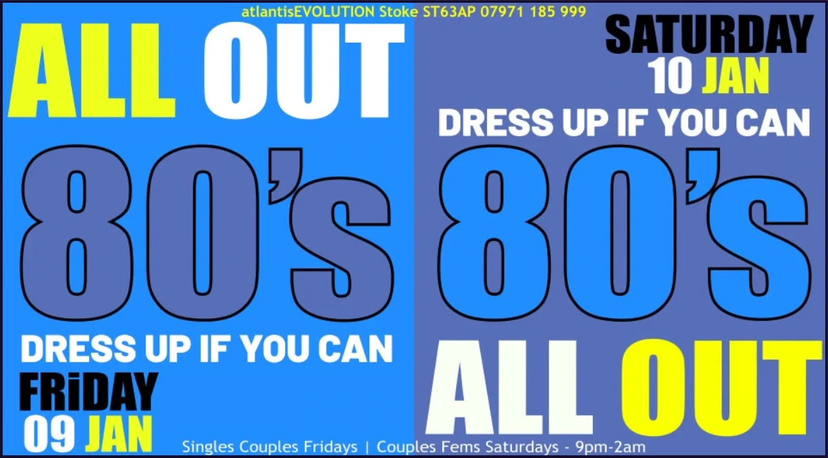 atlantisEVOLUTION Swingers Club. Burslem. Stoke on Trent. VOTED ‘THE’ No 1 NIGHT CLUB THEMED SWINGERS CLUBS IN THE UK. And one of the UK's top Swingers clubs.07971 185 999We also hold Hot Wives Events. Hotwives Events, Fetish Events. Swingers Club and Adult Parties. Fab Swingers Parties. Greedy Fems Parties. BDSM & Fetish Events SDC Hotties Parties. atlantisEVOLUTION. Swingers Clubs. Swinger Club. Swinging Adventures. Swing Stoke. Serving Walsall. Birmingham. Darlaston. Hanley. Swing Club. Midlands. Swingers Clubs Staffordshire. Greedy Girls Staffordshire.