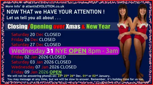 This page is where you will find what big events are on soon and on the Calendar page you will find what’s on a little further into the future.We open EVERYFRIDAY and SATURDAY and Monthly for PlaY Xtra & EVOLUTIONfetish EVENTSCome and let your hair down and leave all that work stuff, family stuff, gossip stuff at home - atlantisEVOLUTION is about having a great night out. Dance to great modern music. Meet and Chill. Two floors, With Two Vibes. Whether you want to party or just chill, or do both, you can at atlantisEVOLUTION.We often have theme nights, could be a music genre or a dress-up theme, these help to give everyone a change of pace or just for fun. Of course there are the usual Birthdays and Holiday themes. Do you have to dress in theme? No. Of course not. But do remember that our minimum dress-code is very smart casual, as if you were attending a nice nightclub or wine-bar. We NEVER run PRIVATE parties on a Friday or a Saturday, so if a Member has a Birthday or Anniversary Event you are always invited, whether you know them or not.Are we a busy club? Mostly we are very busy any night that we are open, but do remember that even the busiest venue can have a quieter night or two and we can party no matter how many people are with us.WE NEVER GIVE NUMBERS ATTENDING OVER THE PHONE (or in any other way - what happens in the club, stays in the club)Joining us for the first time? Don’t forget your ID, we won’t admit without it.Information not up to date? Simply refresh your browser or your cookies.
