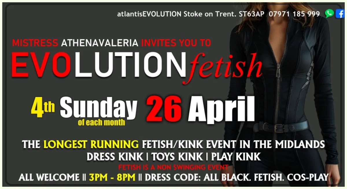 Sunday 26 AprilEvolutionfetishSunday Fetish Events: 3pm-8pmLifetime Membership is £20 ppEntrance is £10 pp.All welcome.DRESS CODE:ALL BLACK. FETISH. COS-PLAYPlease CLICK HEREor the Fetish Link aboveNOTE:FETISH IS A NON SWINGING EVENT