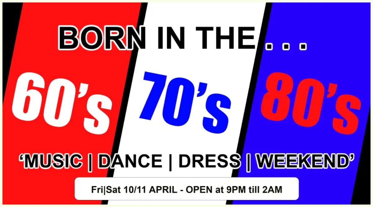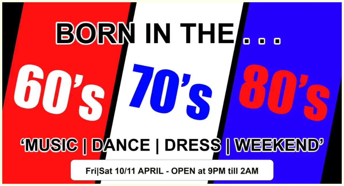 Born in the . . . Friday 10 April60’s|70’s|80’s MEGA MIX WEEKENDYou ask for it, we’ll play it. Dress up if you canAll Fun | Dead Sexy | All Welcome | No need to BookExtended ‘Popular’ April Special - Visit Friday & Get Saturday FREEFriday 10 April 60’s|70’s|80’s MEGA MIX WEEKENDYou ask for it, we’ll play it. Dress up if you canAll Fun | Dead Sexy | All Welcome | No need to Book