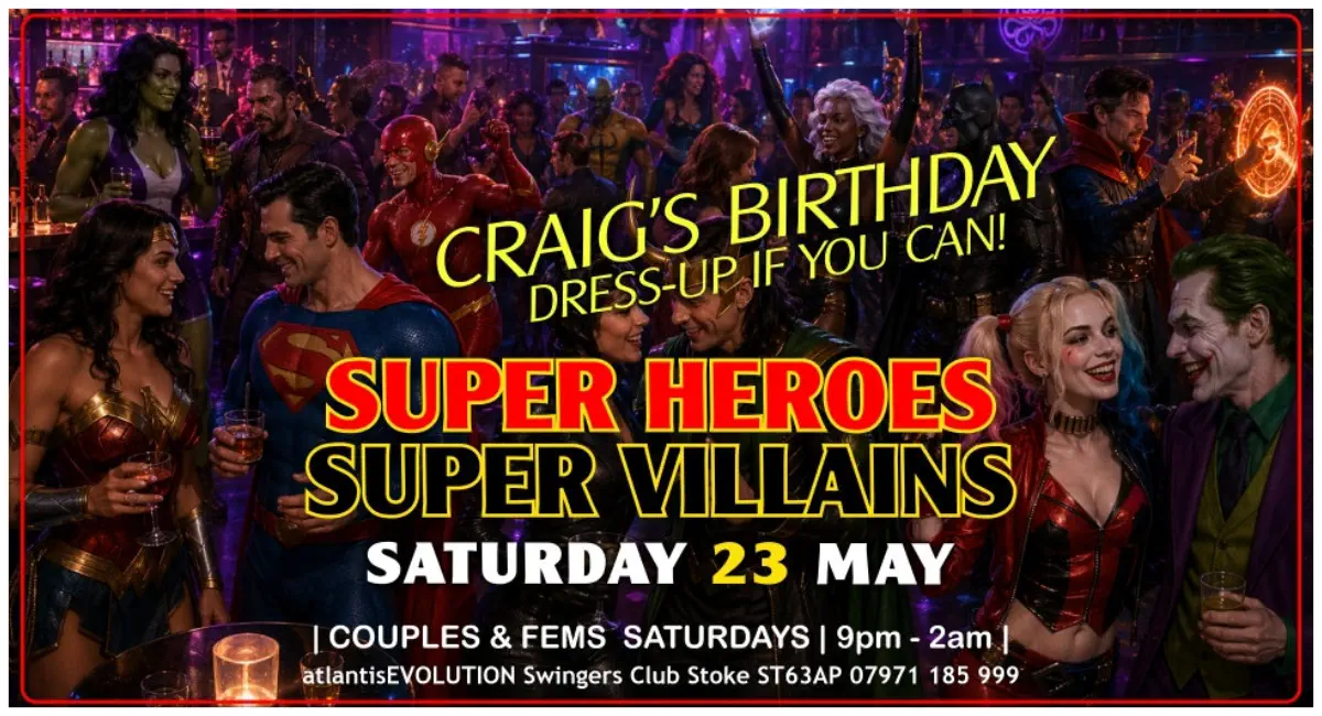 Friday23MayCraig’s Birthday‘SuperHeros SuperVillains’Dress-up if you can!We’re putting the ‘F’ back in Fun andthe ‘S’ back in SexyA whole load of Sex-y-Fun‘Meet. Chill. Chat. and Play!’Couples and Single Fems Saturday9pm-2amBring Proper ID to Join