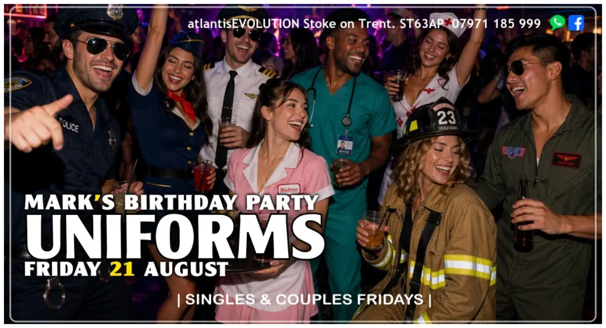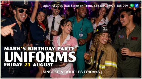 Friday 21 AugustMark’s Birthday Party‘UNIFORMS’Dress up if you can‘A proper fun-filled night out!’Singles and Couples Friday9pm-2amBring Proper ID to Join