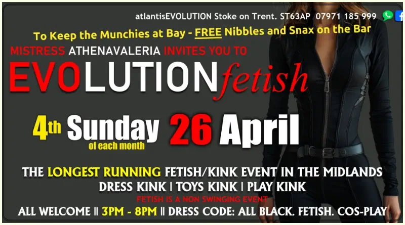 Sunday 26 April4th Sunday of the MonthEvolutionfetishSunday Fetish Events: 3pm-8pmLifetime Membership is £20 ppEntrance is £10 pp.All welcome. DRESS CODE:ALL BLACK. FETISH. COS-PLAYPlease CLICK HEREor the Fetish Link aboveNOTE:FETISH IS A NON SWINGING EVENT
