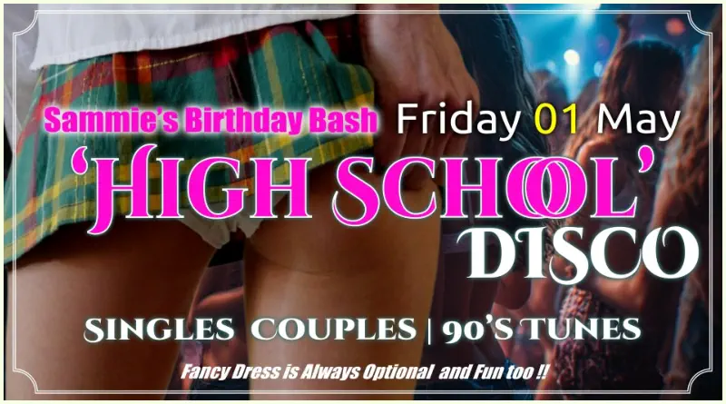 Friday 01 MaySammie’s Birthday‘HIGH SCHOOL DISCO’90’s MusicSingles and Couples FridayCouples and Single Fems Saturday9pm-2am