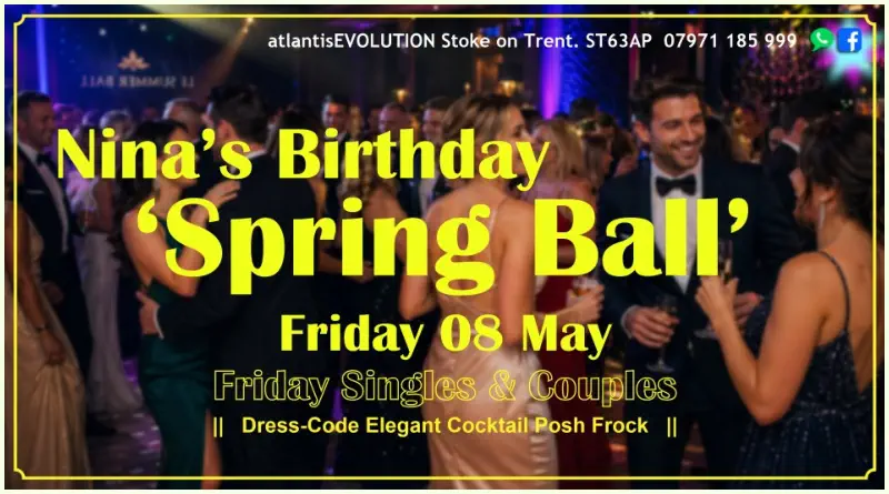 Friday08MayNina’s Birthday‘Spring Ball’Dress Code:Elegant Cocktail Posh FrockSingles and Couples Friday9pm-2am