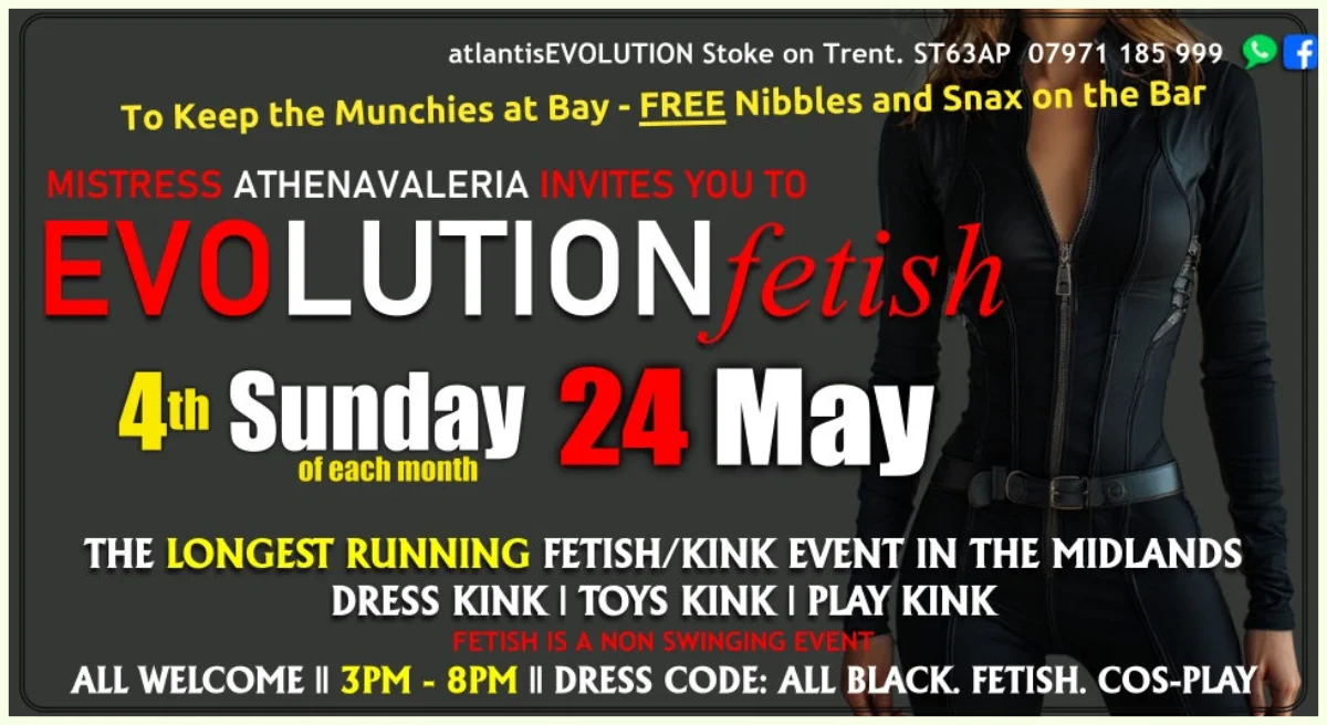 Sunday 24 MayEvolutionfetishTo keep the Munchies away - Free Nibbles and Snax at the BarSunday Fetish Events: 3pm-8pmLifetime Membership is £20 ppEntrance is £10 pp.All welcome.DRESS CODE:ALL BLACK. FETISH. COS-PLAYPlease CLICK HEREor the Fetish Link aboveNOTE:FETISH IS A NON SWINGING EVENT