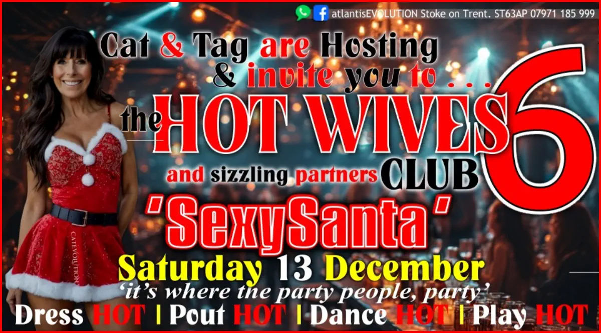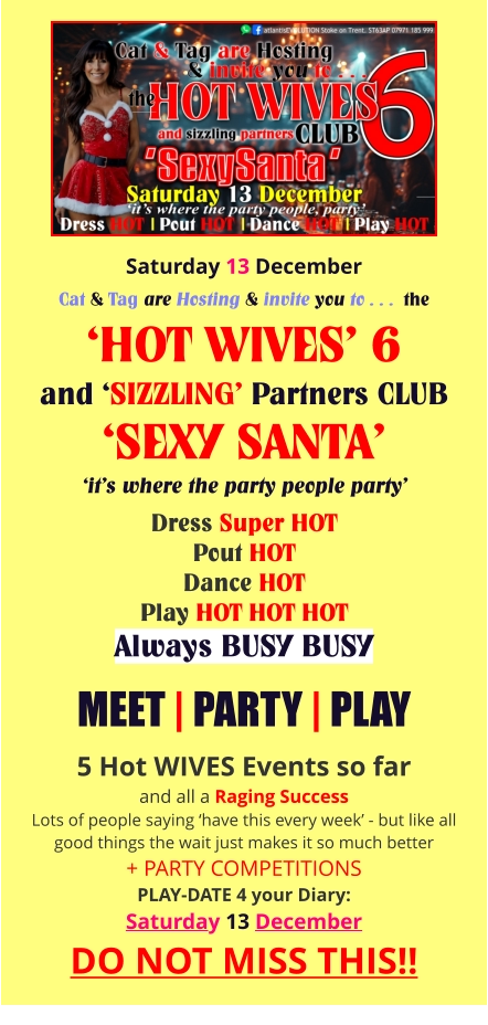 Saturday 13 DecemberCat & Tagare Hosting & invite you to . . . the‘HOT WIVES’ 6and ‘SIZZLING’ Partners CLUB‘SEXY SANTA’‘it’s where the party people party’Dress Super HOTPout HOTDance HOTPlay HOT HOT HOTAlways BUSY BUSYMEET | PARTY | PLAY5 Hot WIVES Events so far and all a Raging SuccessLots of people saying ‘have this every week’ - but like all good things the wait just makes it so much better.+ PARTY COMPETITIONSPLAY-DATE 4 your Diary:Saturday13DecemberDO NOT MISS THIS!!