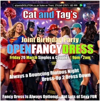 Friday 20 MarchCat & Tag’sJoint Birthday PartyMEGA ‘OPEN FANCY DRESS’ GUEST LISTMake it fun | Make it Sexy |All Welcome |No need to BookGoing to be a Riotous Sexy Fun Night FULL BUFFETExtended ‘Popular’ March Special - Visit Friday & Get Saturday FREESaturday 21 March‘RnB Down Low’ with Cat and Tag’ A Sexy ‘Get to know You’ Night Out Introductions - Sexy Smoochy Dancing - Let’s put some Lurve in your Swinging - New or Regular Members made very welcome.