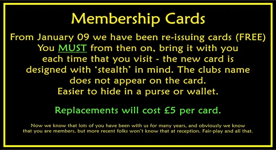 ____________________________________________________Friday: 9pm-2amEntrance Couples: £20+Life Membership is £20(per couple)That’s £40 in total first visit - £20 thereafterEntrance Singles Males: £30+Life Membership is £20That’s £50 in total first visit - £30 thereafterEntrance Single Females: £10+Life Membership is £20That’s £30 in total first visit - £10 thereafter____________________________________________________Saturday: 9pm-2amEntrance Couples: £20+Life Membership is £20(per couple)That’s £40 in total first visit - £20 thereafterEntrance Single Females: £10+Life Membership is £20That’s £30 in total first visit - £10 thereafterSINGLE GENTS ARE NOT ALLOWED ON A SATURDAY____________________________________________________‘Private or Special Events’: 8pm-Midnight1st Wednesday of each MonthSee the ‘Our Nights’ Page for further info’New Members Life Membership is £20 (everybody)Couples: £Single Fems: £Entrance Singles Males: £____________________________________________________Sunday Fetish Events: 3pm-8pmLifetime Membership is £20ppEntrance is £10pp.All welcome.___NOTE: FETISH IS A NON SWINGING EVENT ___You will be issued with a membership cardplease bring this with you each time that youvisit. Memberships are NOT transferable.Lost membership cards can be replaced for free if you are visiting us frequently - if you are not a frequent visitor, cards are replaced at £10 each.Do not arrive drunkNew to Swinging?Always wanted to give it a try? Have you been putting it off? Some of your questions answered . . .•Are swinging clubs legal?oWell we certainly are, we are fully licensed by our local authority. Not allclubs are fully legal - some are not even known to their local authority.•Is it confidential?oYes. We are fully registered with ICOand GDPR Compliant See below under things you should know.•What’s it like in there?oIt’s just like a nice nightclub. •Is it full of weird people?oNo. Everyone is quite normal. Well just as normal as you are at least.•Is it welcoming?oUnbelievably.•Is it friendly?oVery.•We are New to Swinging can we Play on our own or just watch or be watched?oYes of course you can. Nobody would think that strange.•When can I join?oSingle Fems and Couples can join any day that we open. Single Gentlemen can join Friday or on other selected events (see our calendar). •I’m a single female will I be welcome.oVery. And we will go out of our way to help and assist you. •Can I call for a chat?oYes of course you can. See times/days that we are available on our contact page.•Can we Play anywhere in the Club?oEverywhere, but reception and the smoking deck. Why not make this the year that you started swinging. You really will wonder why you took so long to do so.