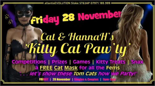 Friday 28 NovemberCat & HannaH’sKitty Cat Paw’tyCompetitions | PrizesGames | Kitty Treats Snax | Sexy FunThis is going to be asuper-sexy super-fun nightSingles and Couples Friday9pm-2amBring Proper ID to Join
