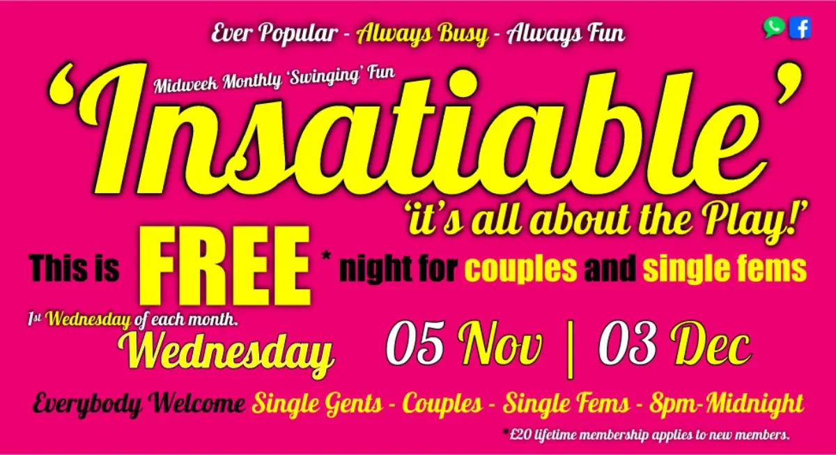 Wednesday 05 November‘Insatiable’it’s all about the Play!’1st Wednesday of each month 8pm till Midnight FREE4Couples & Single FemsEVERYONE WELCOME SINGLES / COUPLES / FEMS