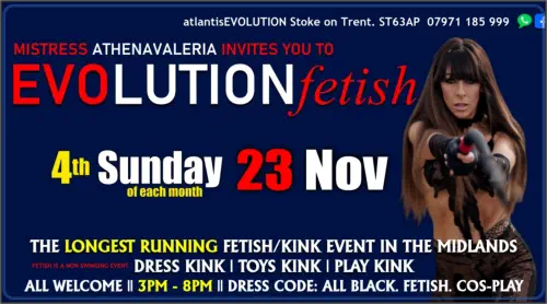 Sunday 23 NovemberEvolutionfetishSunday Fetish Events: 3pm-8pmLifetime Membership is £20 ppEntrance is £10 pp.All welcome.DRESS CODE:ALL BLACK. FETISH. COS-PLAYPlease CLICK HEREor the Fetish Link aboveNOTE:FETISH IS A NON SWINGING EVENT
