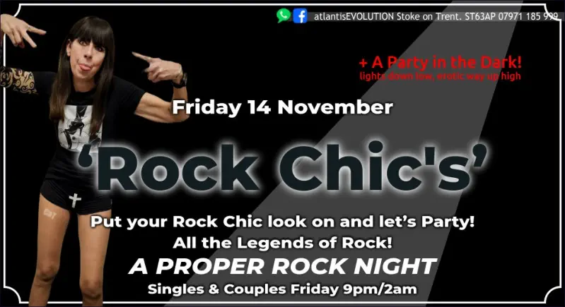 Friday 14 November‘ROCK CHIC’S’Put your Rock Chic Look on and let’s party!All the Legends of RockA PROPER ROCK NIGHT+ Incorporating‘A PARTY in the DARK’Singles and Couples Friday9pm-2amBring Proper ID to Join
