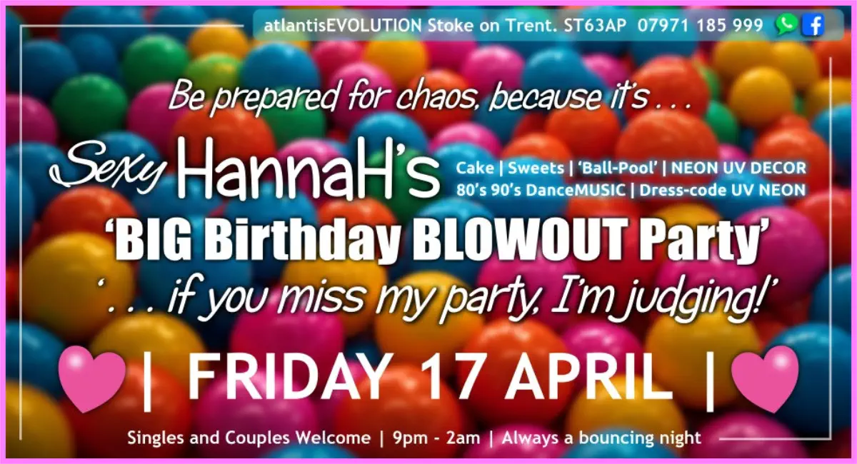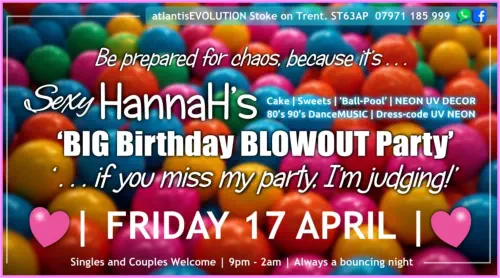 Friday 17 AprilHannaH’sMEGA BIG BirthdayBLOWOUT Party“If you miss my birthday party, I’m judging.”‘A proper fun-filled night out!’Singles and Couples Friday9pm-2amBring Proper ID to Join