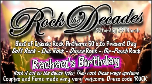 Saturday 14 MarchRachael’s Birthday‘Rock The Decades’Best of Classic Rock Anthems 60’sto the Present DaySoft Rock - Chic RockDance Rock - Air-Punch RockRock it out on the dance floor Then rock those walls upstairs‘Meet. Chill. Chat. and Play!’Couples and Single Fems Saturday9pm-2amBring Proper ID to Join