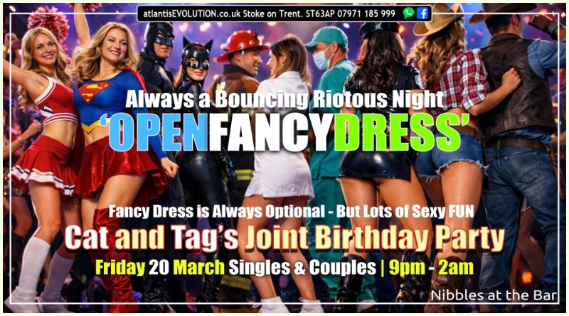 Friday 20 MarchCat & Tag’s Joint Birthday Party‘OPEN FANCY DRESS’Make it fun | Make it SexyGoing to be a RiotousSexy Fun NightNibbles at the BarEVERYONE WELCOMESINGLES / COUPLES / FEMS Bring Proper ID to Join