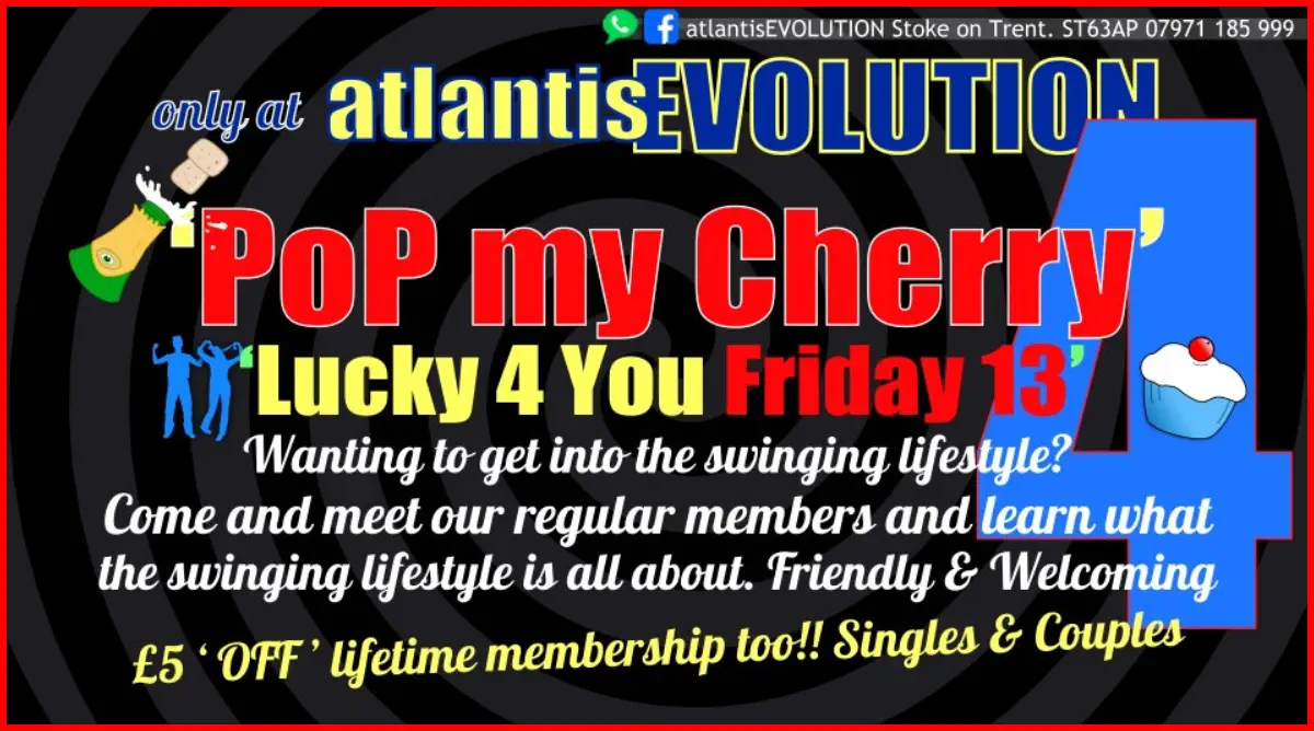Friday 13 March ‘PoP my Cherry 4’Friday 13th‘Lucky for you Friday’Let’s PAAAAARTY!Newbie wanting join?Get £5 off lifetimemembership too and come and see what the swinging lifestyle is all about‘Friday! the banging night out!’Singles and Couples Friday9pm-2amBring Proper ID to Join